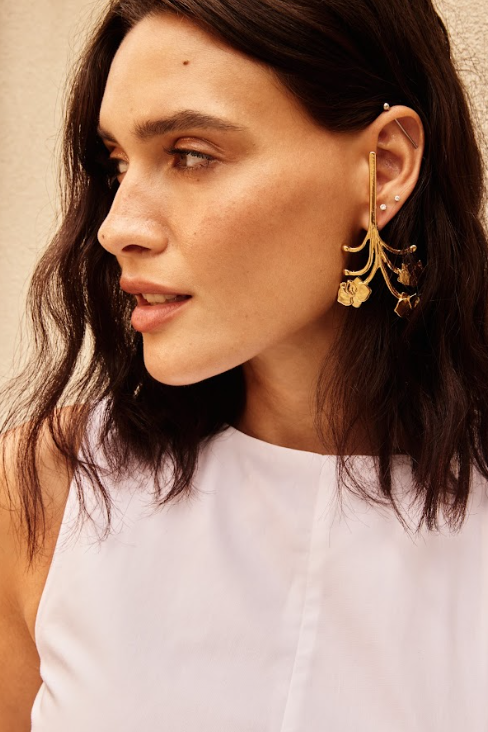 A partir dessa essência, o desenho evolui com referências do art nouveau, trazendo linhas orgânicas e fluidas que acompanham o movimento natural da flor, como se ela estivesse viva na peça.