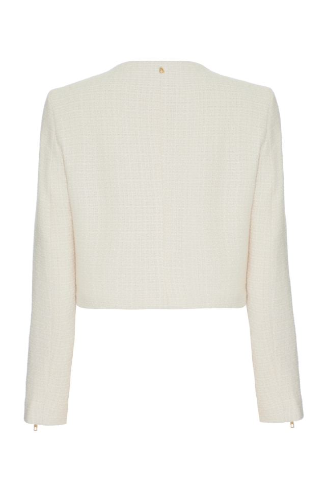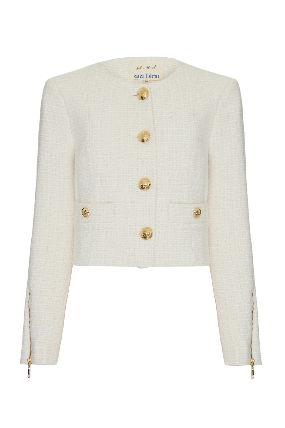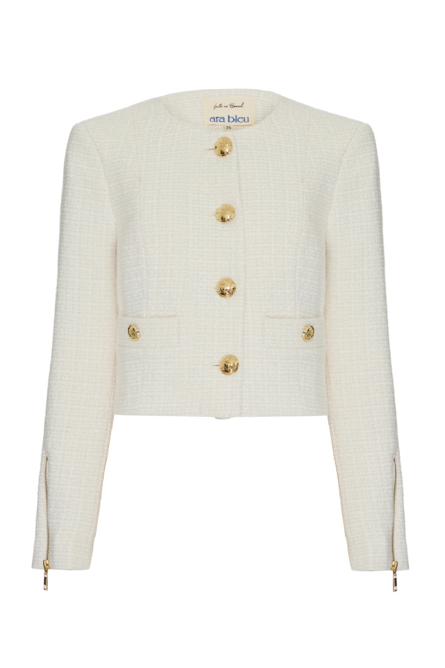 É um dos grandes clássicos da Ara Bleu — reeditado a cada coleção por sua força, elegância e versatilidade. Nesta versão, ele é confeccionado em lã batida com acabamento em tweed, o que reforça sua textura rica e sofisticada. De comprimento cropped e modelagem estruturada, a peça conta com botões frontais dourados que levam o icônico “A” da Ara Bleu, além de dois botões decorativos nos bolsos frontais. As mangas trazem um detalhe marcante: zíperes metálicos dourados, que podem ser usados abertos ou fechados, adicionando um toque fashionista ao look. Atemporal, chique e com personalidade — é aquele casaco que eleva qualquer produção.