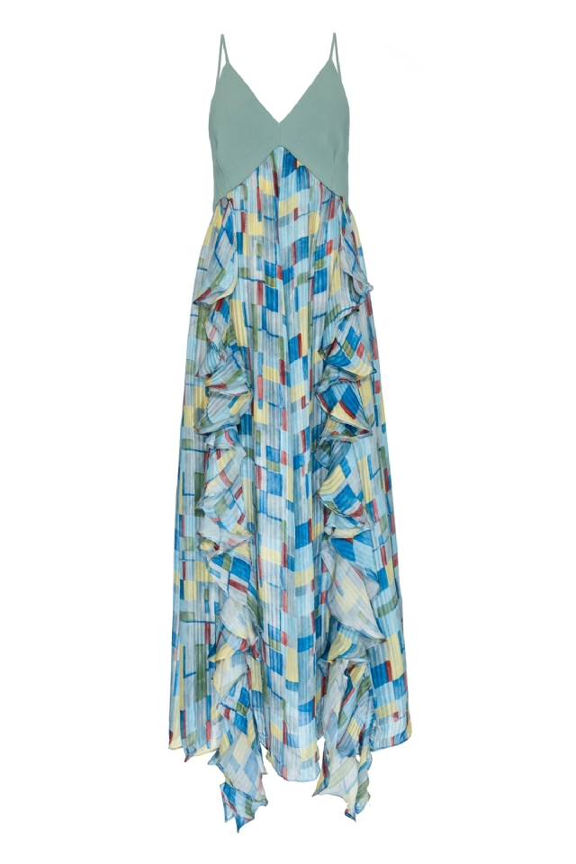 Com alças finas e decote em V, o vestido conta com recorte triangular que valoriza a silhueta. A saia apresenta babados espiralados e barra assimétrica, criando movimento e volume de forma elegante. A estampa geométrica em tons de azul, verde, amarelo e vermelho completa o visual com um toque artístico e contemporâneo.